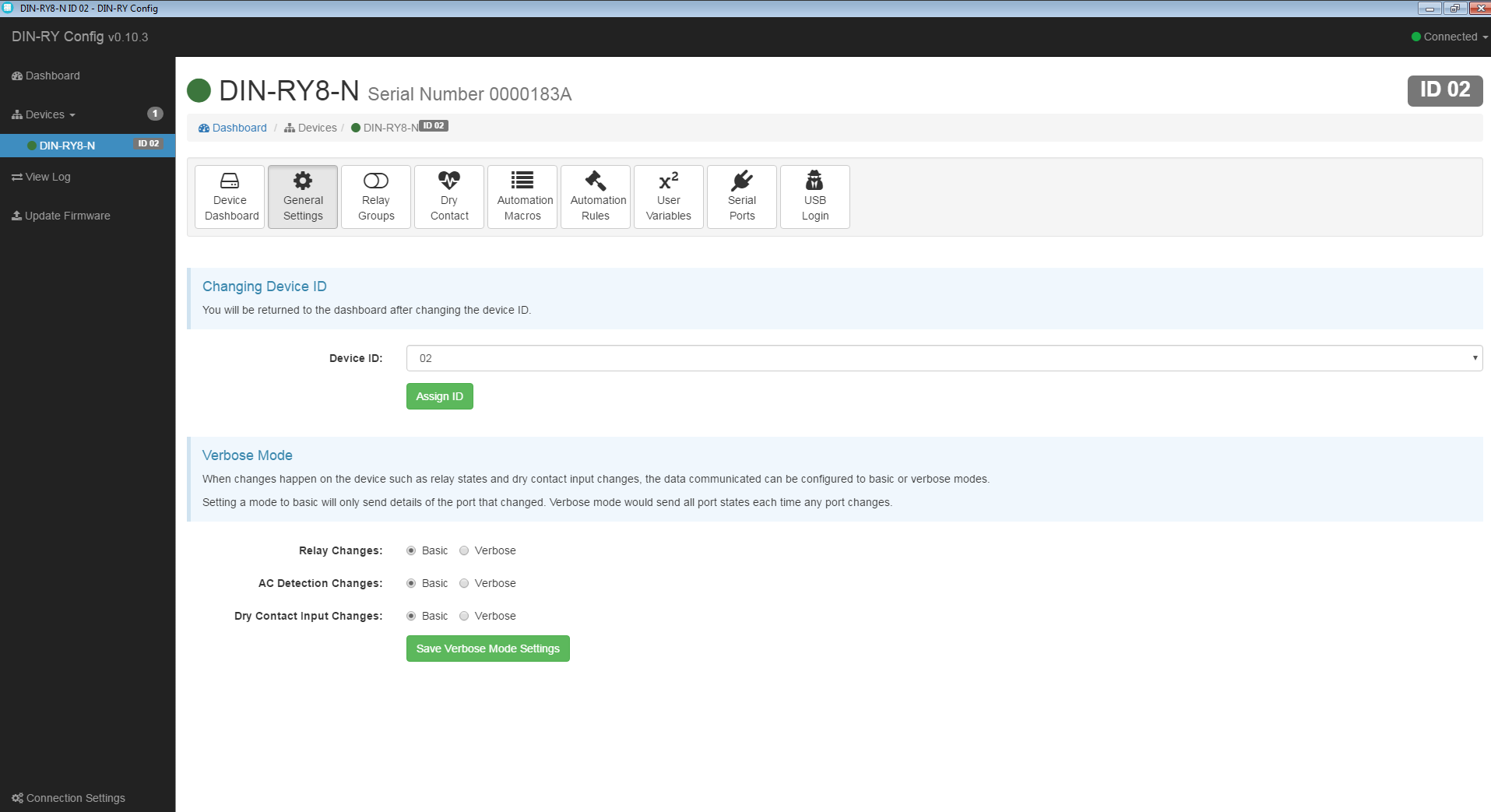 You can change the device ID by selecting the available ID from the drop-down selection and then clicking the Assign ID button. When changes happens on the device such as relay actions, AC Load and dry contact status - you can specify the mode for the feedback that comes back.